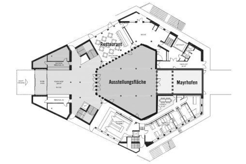 Die große Fläche im Erdgeschoss eignet sich perfekt für Ausstellunge sowie als Cateringbereich, wahlweise in Kombination mit dem Restaurant, dem Saal Mayrhofen und dem Eingangsbereich.